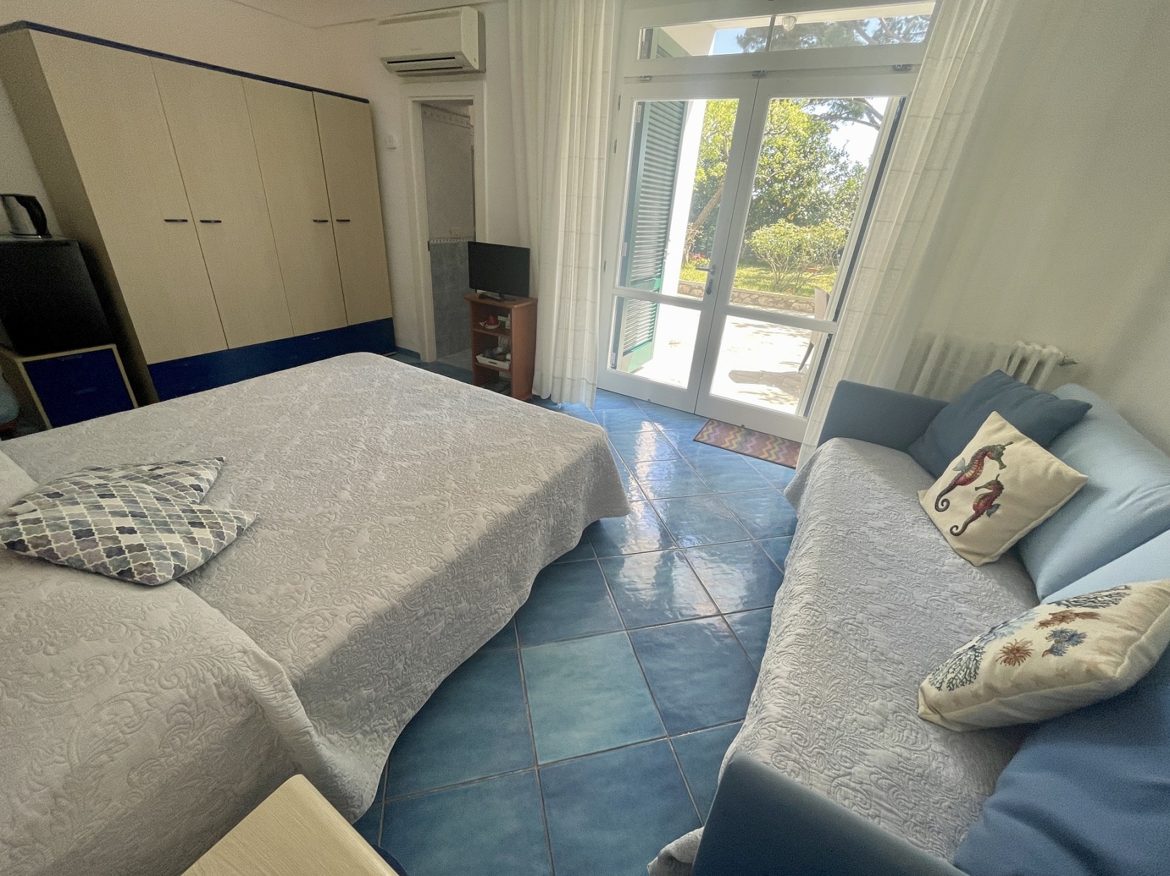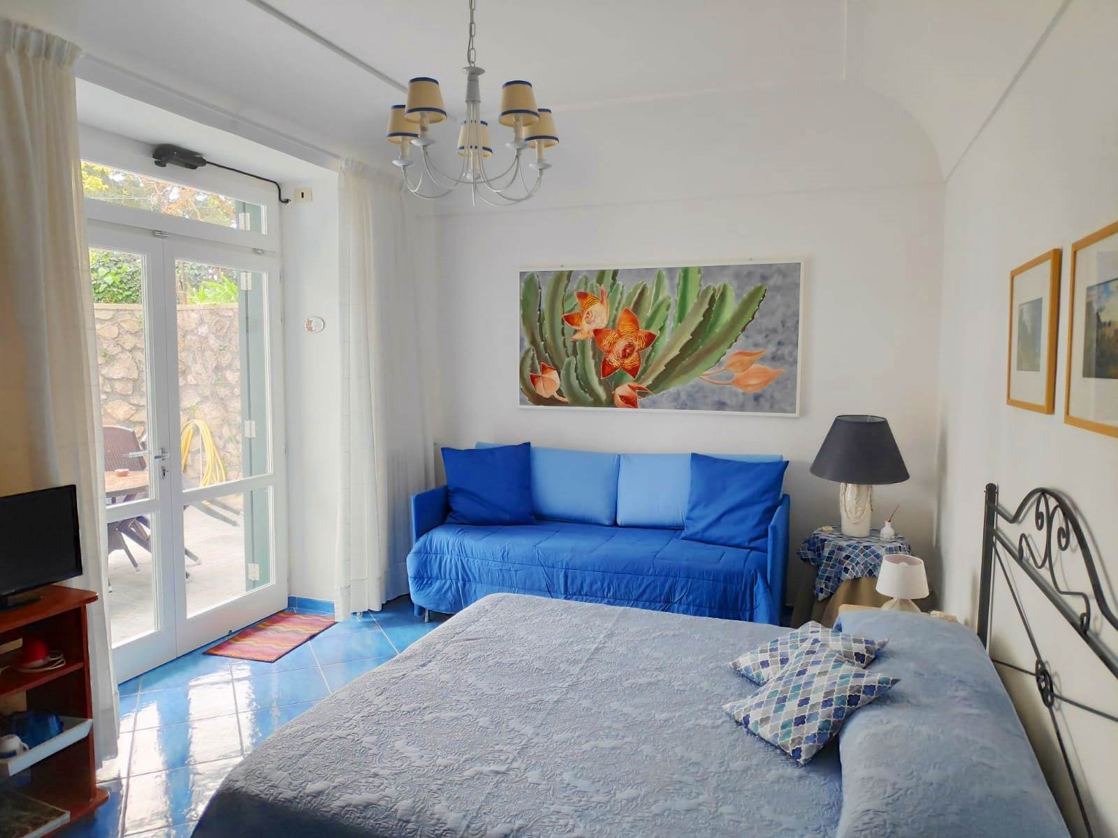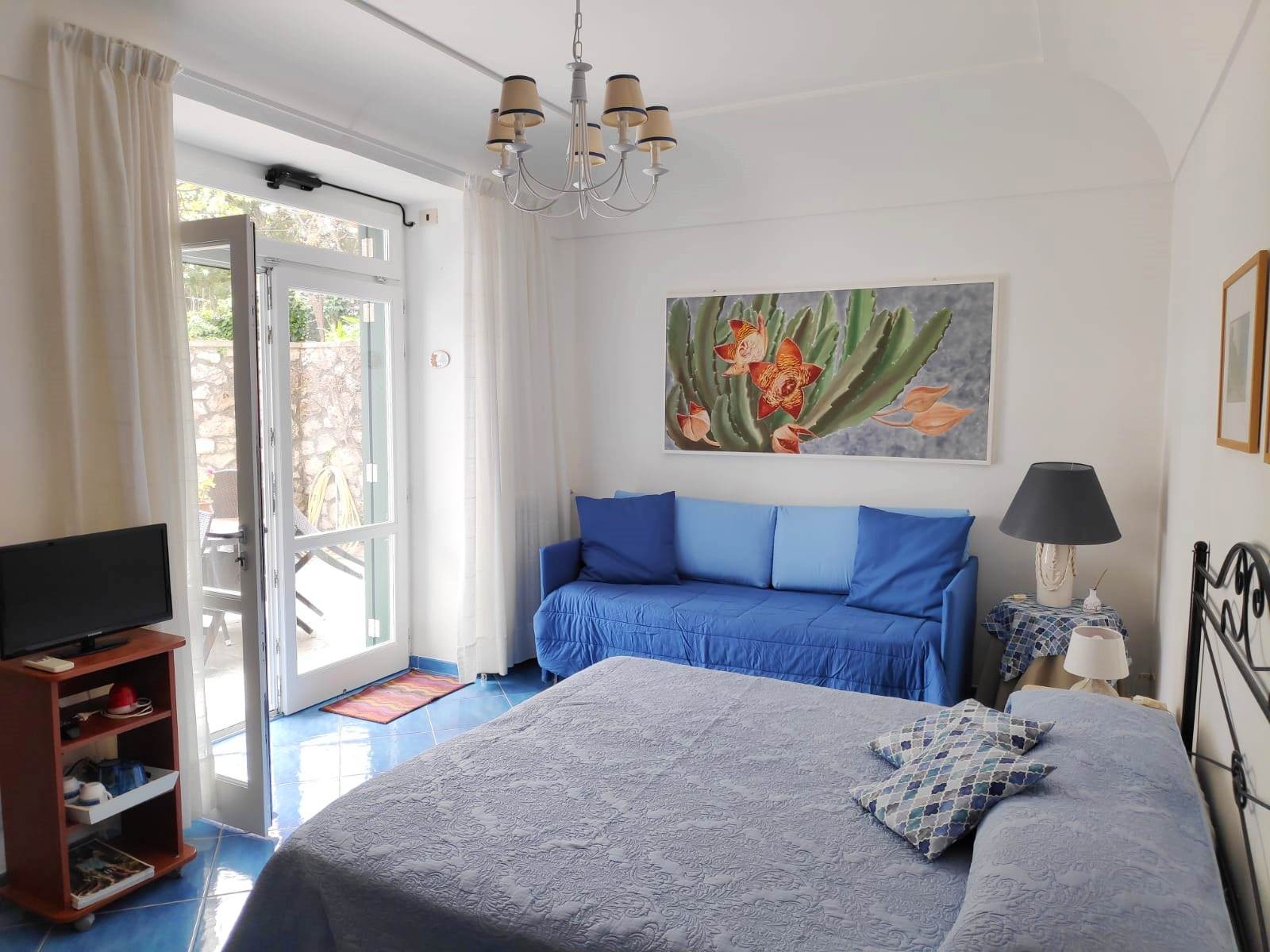 The spacious and bright room opens onto the green embrace of a Mediterranean garden, filled with the scents of flowers and citrus. It offers a warm and comfortable refuge for relaxing stays on the island. Every morning, under the gentle shade of trees and the sea breeze, an outdoor breakfast awaits guests in a private corner, nestled between the green garden and the blue sea. The bathroom, carefully detailed, provides everything needed for moments of well-being.