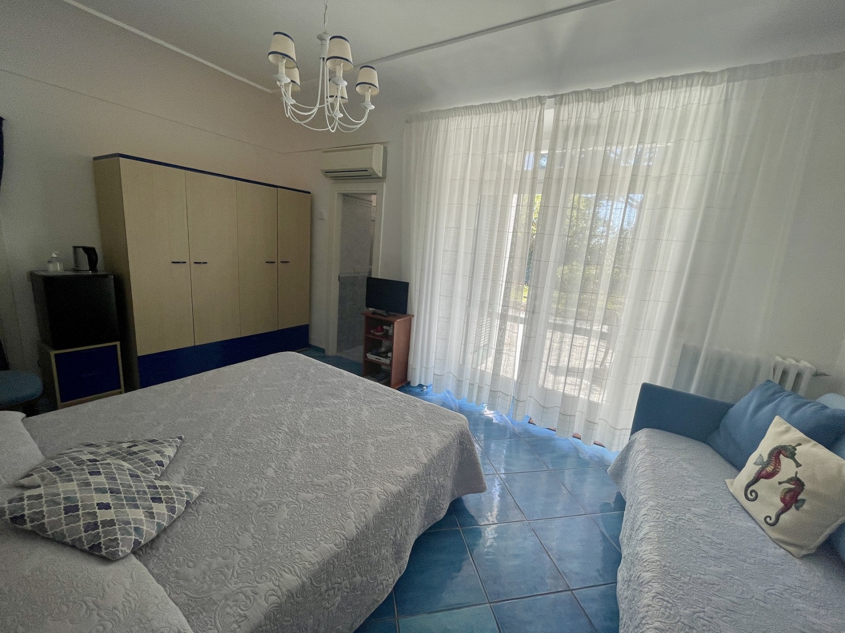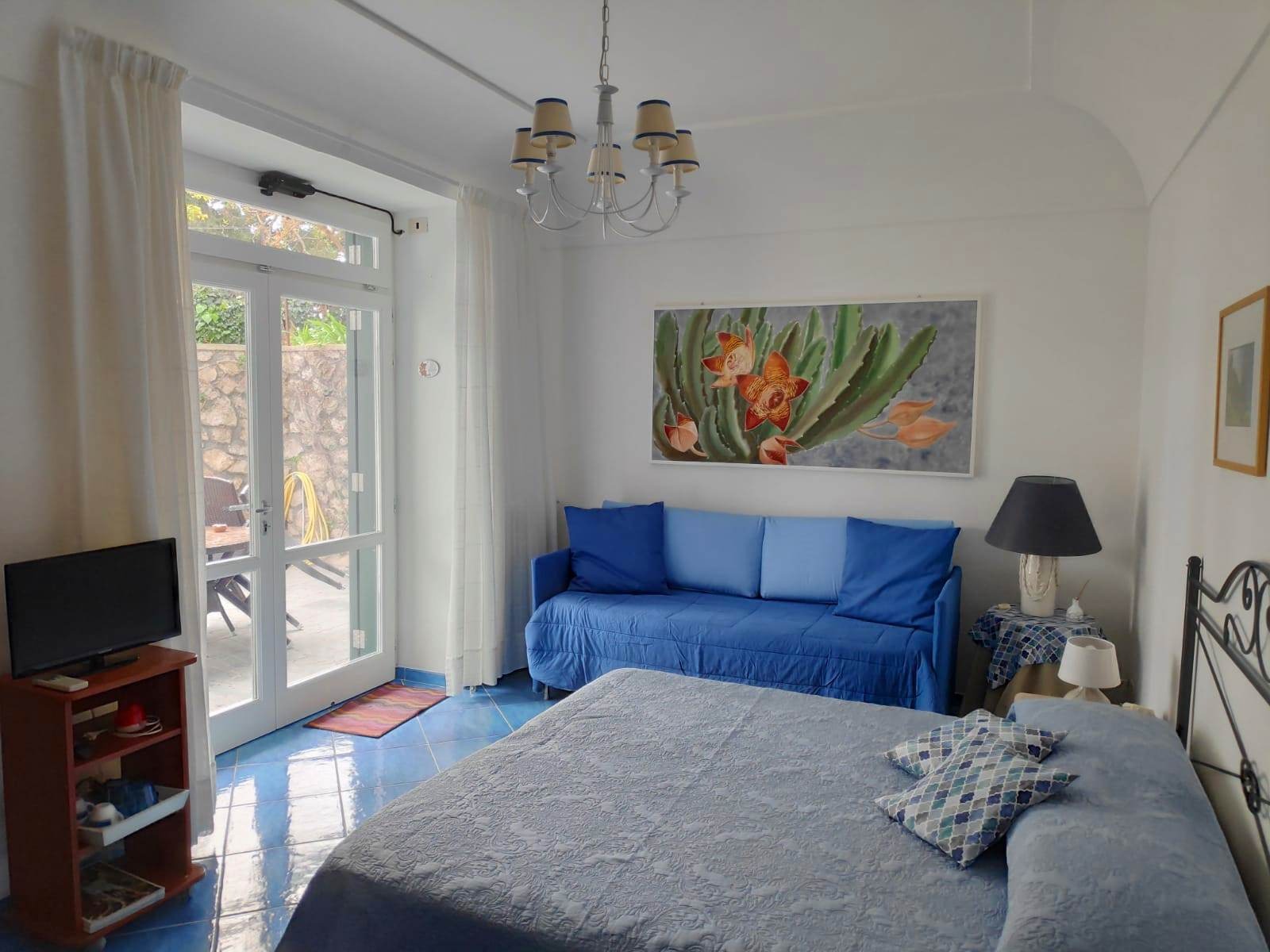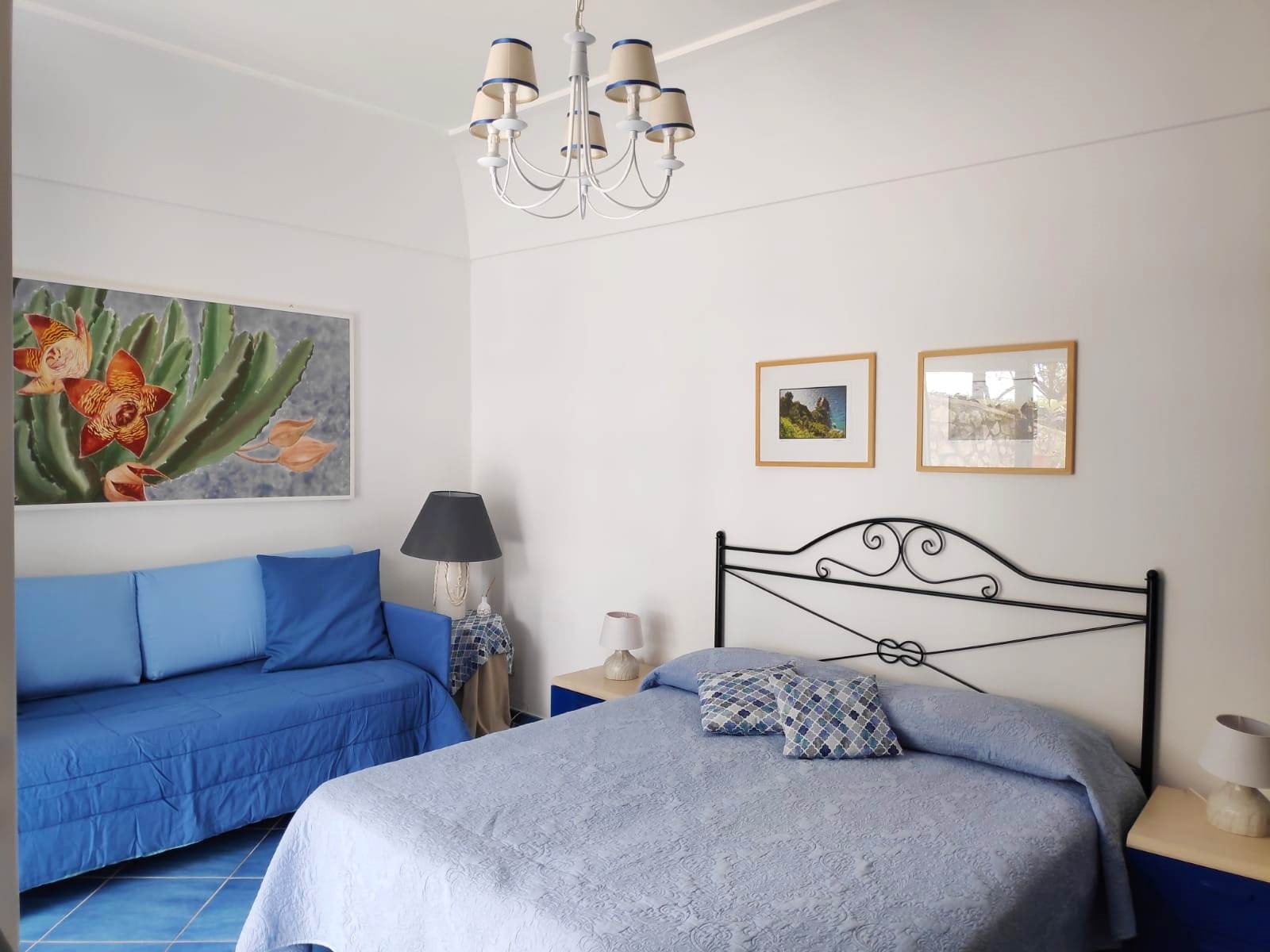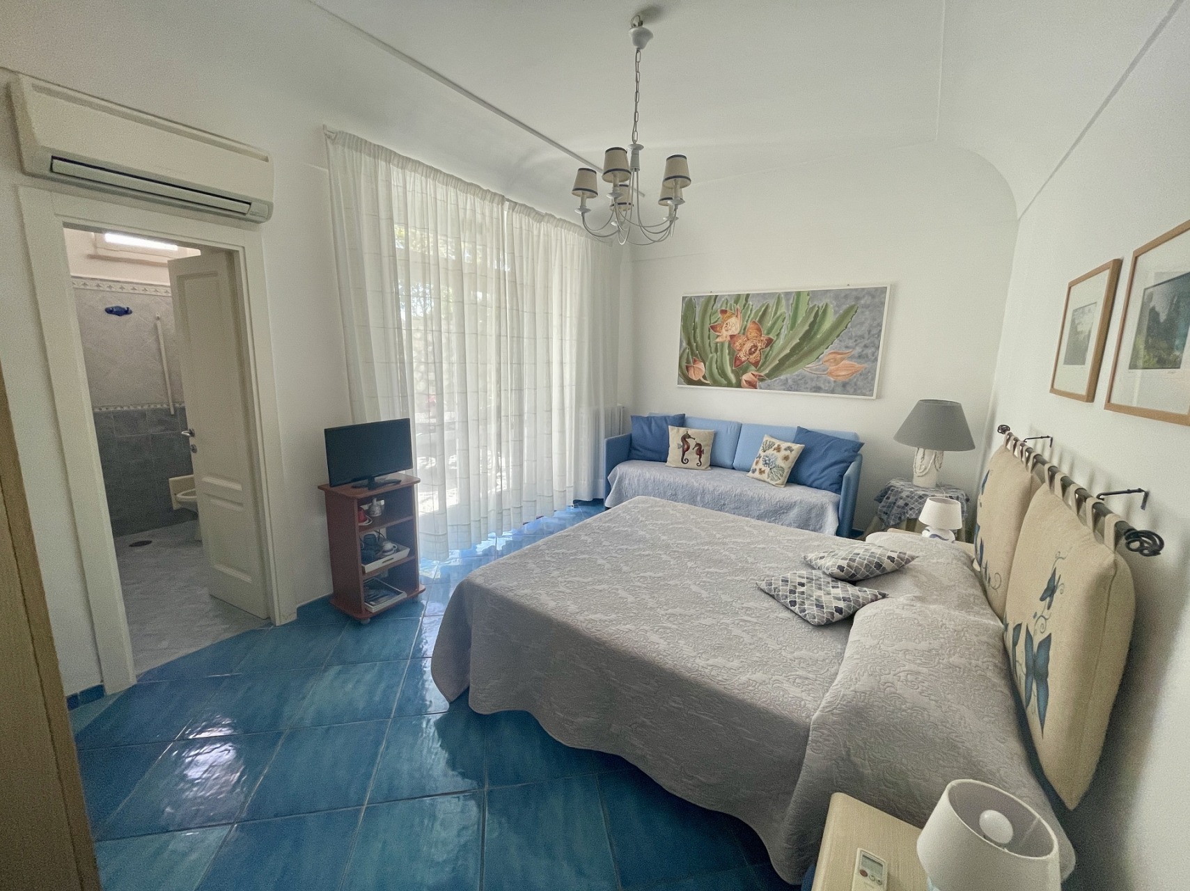The spacious and bright room opens onto the green embrace of a Mediterranean garden, filled with the scents of flowers and citrus. It offers a warm and comfortable refuge for relaxing stays on the island. Every morning, under the gentle shade of trees and the sea breeze, an outdoor breakfast awaits guests in a private corner, nestled between the green garden and the blue sea. The bathroom, carefully detailed, provides everything needed for moments of well-being.