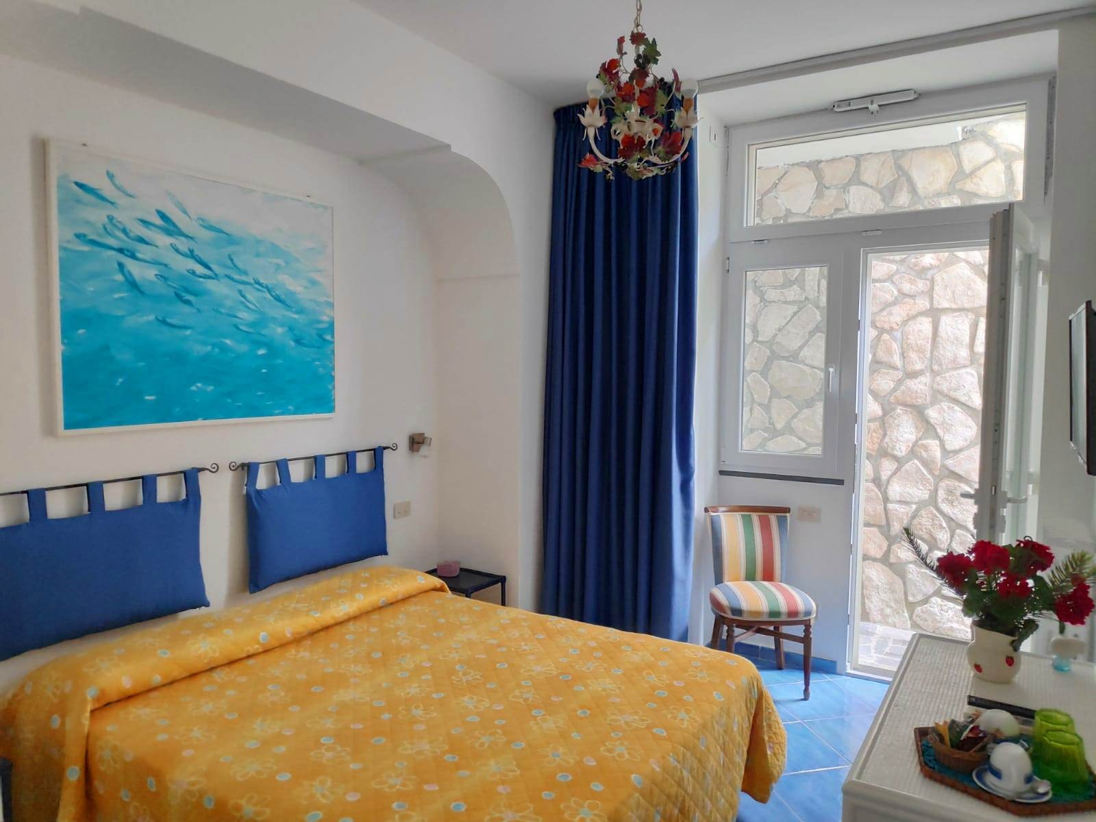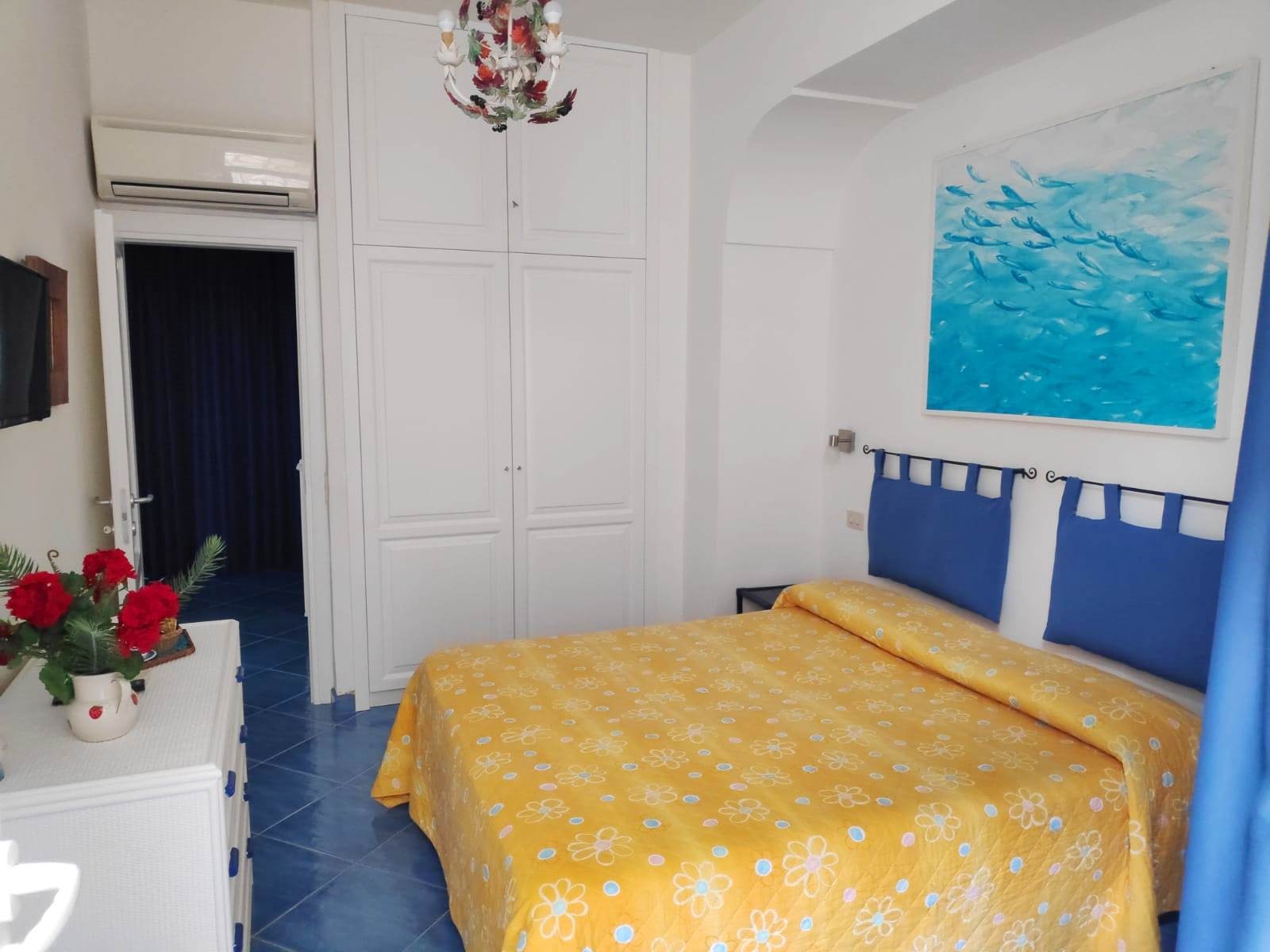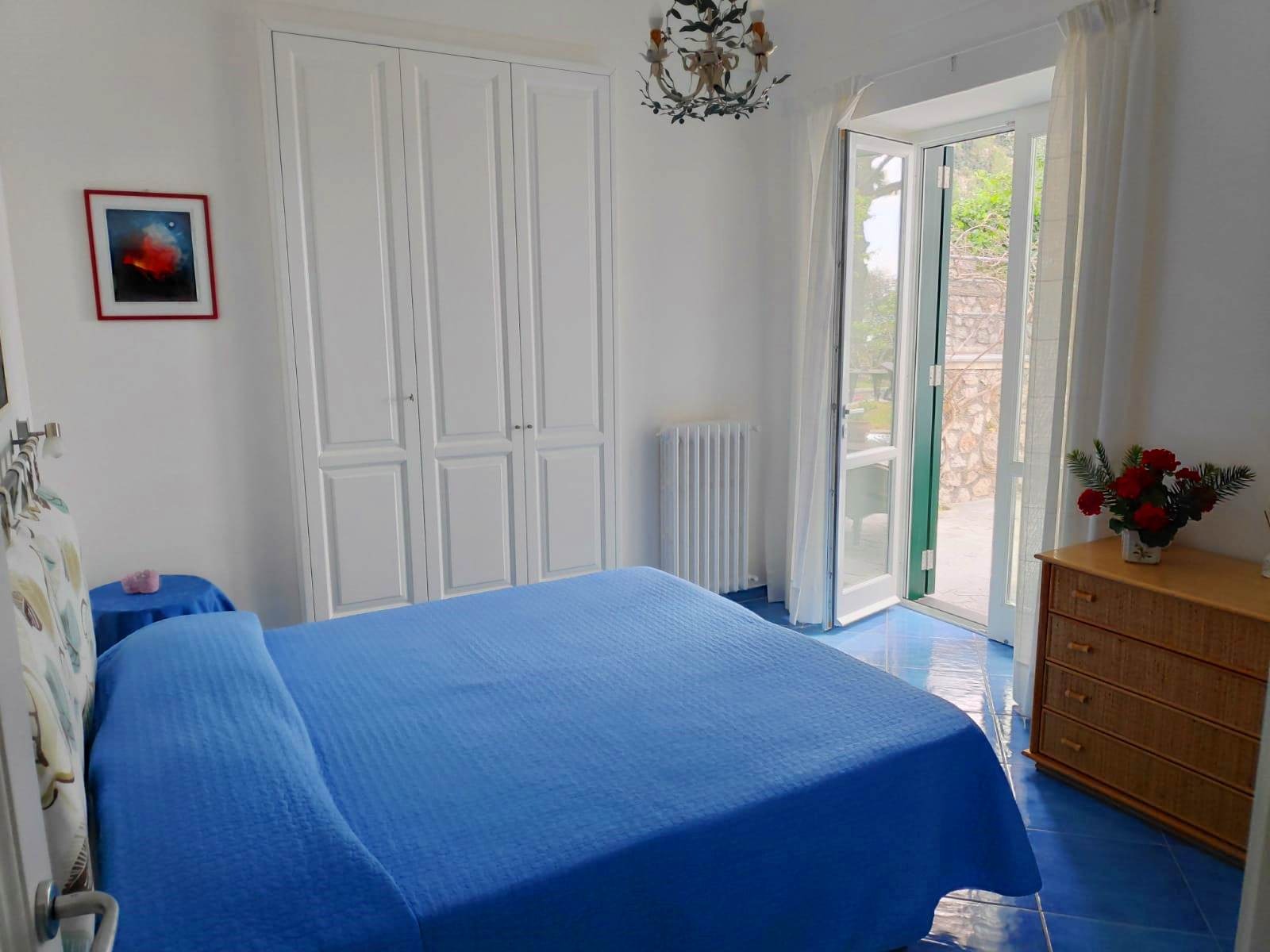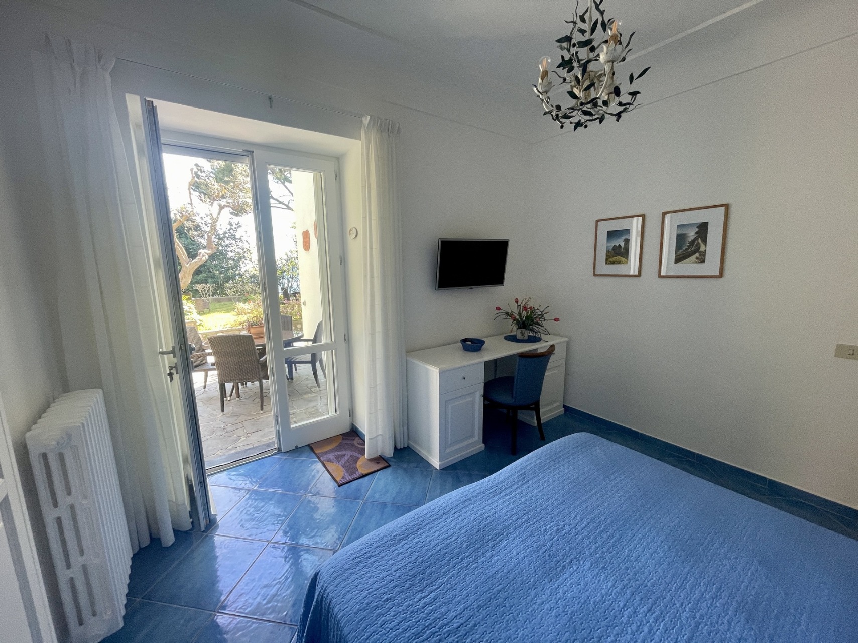 The room welcomes guests with understated and relaxing elegance. Furnished in a modern style with light tones that evoke the light and harmony typical of the island, it perfectly matches the Capri atmosphere. The French door opens onto a peaceful corner: a private area in the garden, equipped with a small table, chairs, an umbrella, and comfortable loungers, ideal for enjoying breakfast outdoors or moments of pure relaxation. A true oasis of peace that allows you to experience every season in maximum comfort.