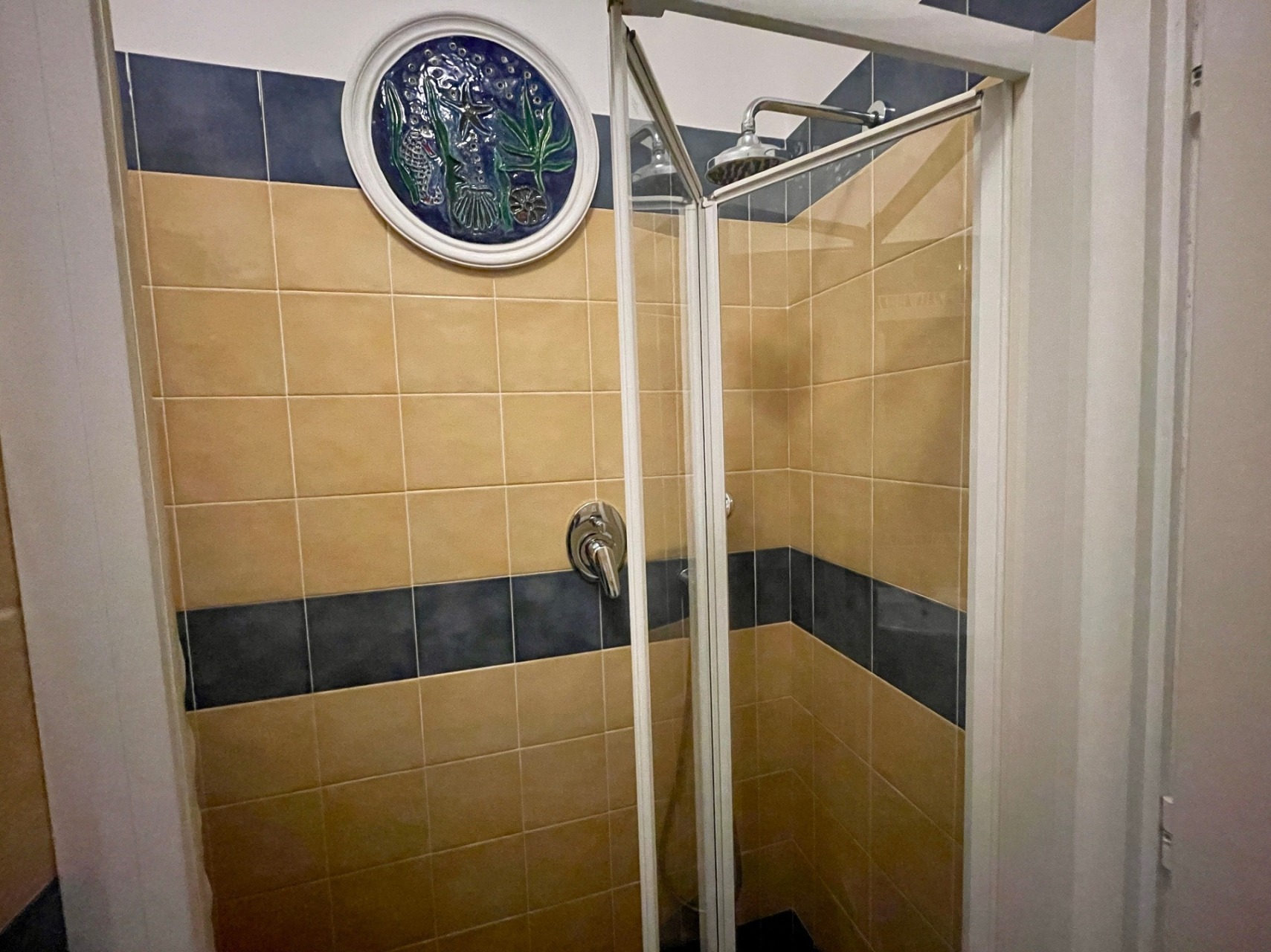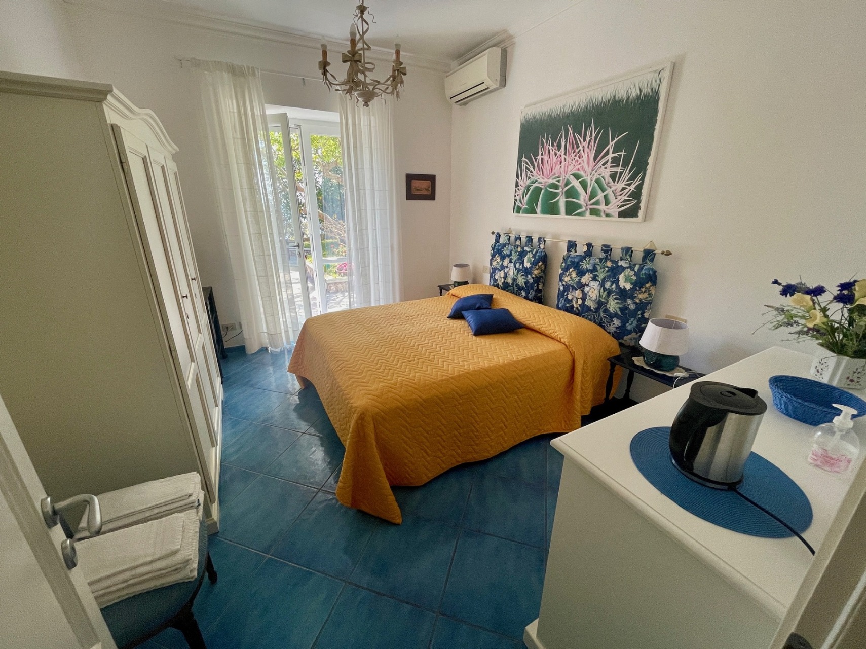 Intimate and cozy, the room welcomes guests with warmth and comfort, lit by a French door that opens onto a delightful flowered garden, scented with Mediterranean essences. Here, among lush plants and enchanting colors, there is a private area with a table, chairs, and an umbrella, where breakfast is served outdoors every morning, wrapped in the tranquility and sweetness of the island. The private bathroom is equipped with a shower and all the necessary comforts for a pleasant stay.